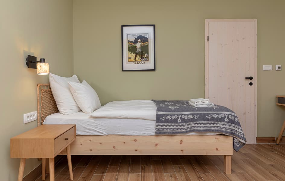 The ground floor, two-bedroom apartments sleeps 5. It features a bright, sunny living room with a wood-burning stove as well as a luxurious, an ensuite bathroom with a bathtub, and a full kitchen (replete with quality cooking-/diningware, a dishwasher, microwave, large range and oven, large refrigerator, Nespresso coffee maker and frother, and toaster). It is adorned with Danish modern furniture, Slovenian artwork and prints, Turkish kilims, alpine blankets woven nearby in Bohinj, and it has a wide assortment of books and games for all ages.
